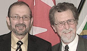 | | Jim Hnatiuk, recently chosen leader of the Christian Heritage Party, spoke at six meetings on a tour of British Columbia in February, Hnatiuk (left) is pictured here with his predecessor, long-time leader Ron Gray, in Abbotsford February 8. At the meetings Hnatiuk outlined party policies on government finances, family law and health issues. He argued that the Christian community's lobbying efforts and work to elect Christian MPs from other parties hae failed to have any impact, because party discipline keeps those MPs from voicing Christian viewpoints. |